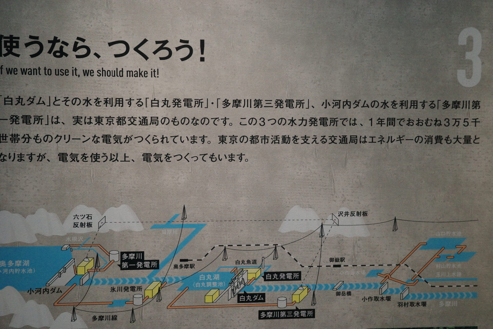 「白丸ダム」では多摩川の水を貯め込んで、下流の多摩川第三発電所と白丸発電所に水を放流し、発電をしています。